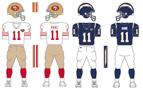 #7) 49ers-Patriots: SF in white/gold, NE in navy/silver. Metallurgy at work. Gold and silver, or as Burl Ives sang it a long time ago, "Silver and Gold." Plus the red trin on the Niners and the predominant navy of the Patriots. One of a number of good matchups this week.